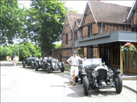 Drove through the lovely Cotswold's from Stratford to Bath. The Cotswolds are without a doubt one of the prettiest areas of England, well known for its gentle hillsides ("wolds"), river valleys, water meadows, beech woods and dry stone walls. Ancient honey-coloured limestone villages and historic market towns are scattered throughout the countryside. Decided to skip the hotel breakfast this Sunday morning. The sun was just starting to penetrate the mist (it was like reading Brigadoon - with the Scottish mist), no traffic and no noise. We drove through quiet Chipping Campden and stopped for breakfast in the market town of Broadway, where we could sit outside! By 11 am the crowds arrived and we sprinted on. I was navigating and we took a wrong turn and ended up in Bourton-on-the-Water (where we were supposed to be later in the day after visiting Prescott). The town was absolutely packed with people sitting on the lawn having picnics on this most beautiful day. We enjoyed our pint of shandy and cigar sitting on a river bank outside a pub. Parked the car in front of the local Motor museum where Roger got nostalgic. They had a 1937 Austin Clifton with a dickey seat (exterior passenger seat located in the rear/boot), the same car he owned some 35 years ago. Then went on to Prescott where the Buggatis have their home, there has been top flight motor racing here for almost 80 years. The famous hill climb had very tight corners, not so good for the Bentley, so we did not use the track but we watched some cars racing up the hill in 42 seconds (world record is 31 seconds). The smell of hot motor-oil, hot tarmac and the sound of a well tuned engine, who could ask for anything more?!. Motored on and eventually arrived in Bath in the sweltering heat, one car had a broken half shaft/rear axle, probably from the Prescott Hill climb, while other car troubles included radiators, brakes, magnetos etc. Most of the cars got fixed on the free day in Bath.