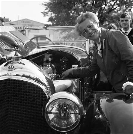 Miss E. Nagle examines the engine of her 1925 Boat-tail Bentley during a stopover during the International Veteran and Vintage Car Rally in Australia.
