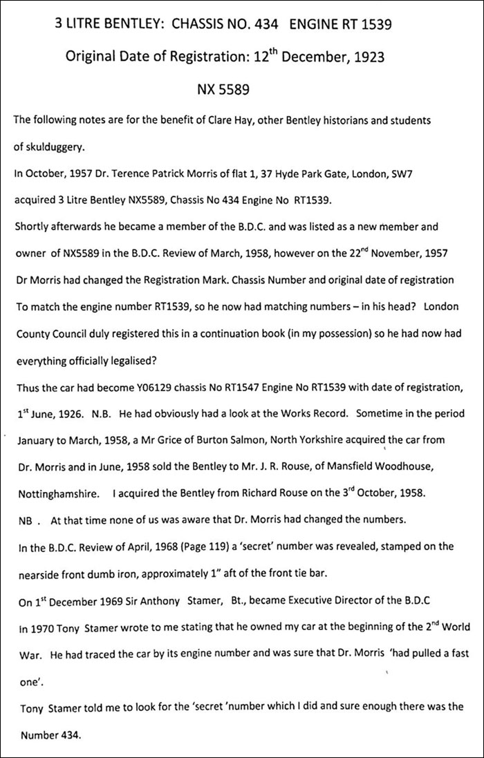 According to Technical Facts of the Vintage Bentley (at p.6) chassis No 434 is listed as a 'Speed' model with a 9' 9 1/2" wheelbase having been registered with the London County Council.