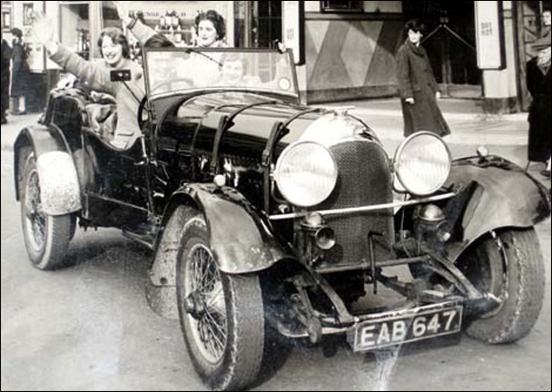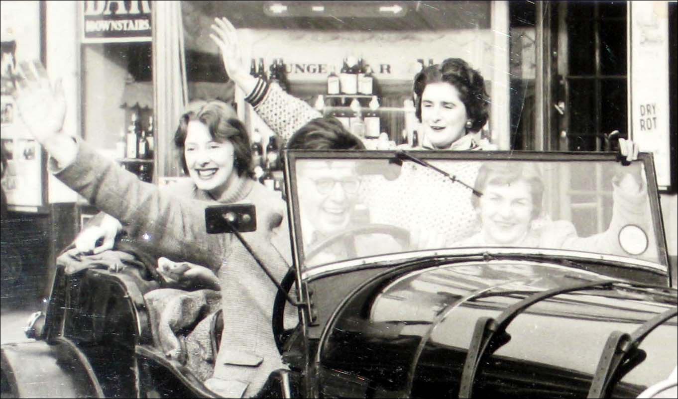 "Three girls and their 'chauffeur' driving by waving merrily. In the background a 'Bar Downstairs' and a garage entry marked left and right with 'Dry Rot'. Is it a photo of a student party? A film shoot? And what happened with EAB647?