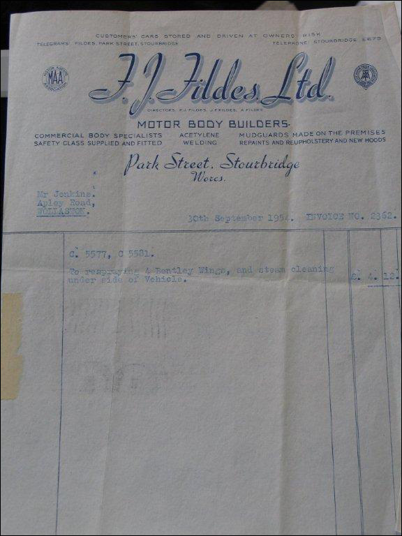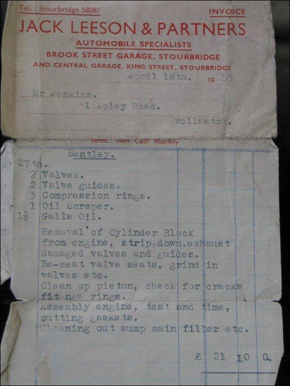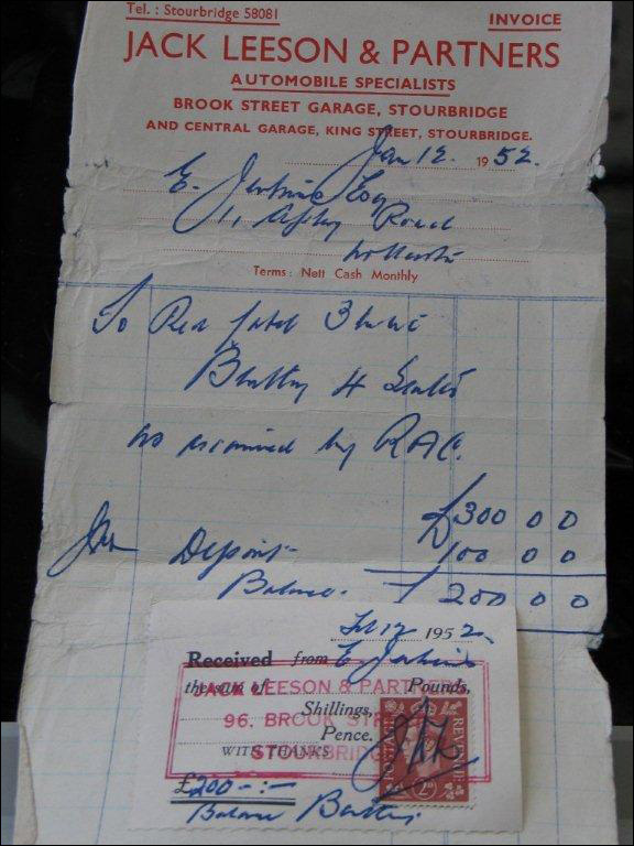 1952: Edward Jenkins bought the car on Jan 12, 1952. Picture of invoice for £300 above; also picture of invoice for engine work and paint work.