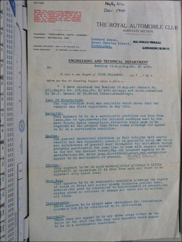"The Bentley record I have gives all the owners up to 1940 ending with a flying officer, A. Zweigbergk at the Officers Mess, RAF South Cerney, Gloucester. It also lists every job done on the car from 1924-1940."