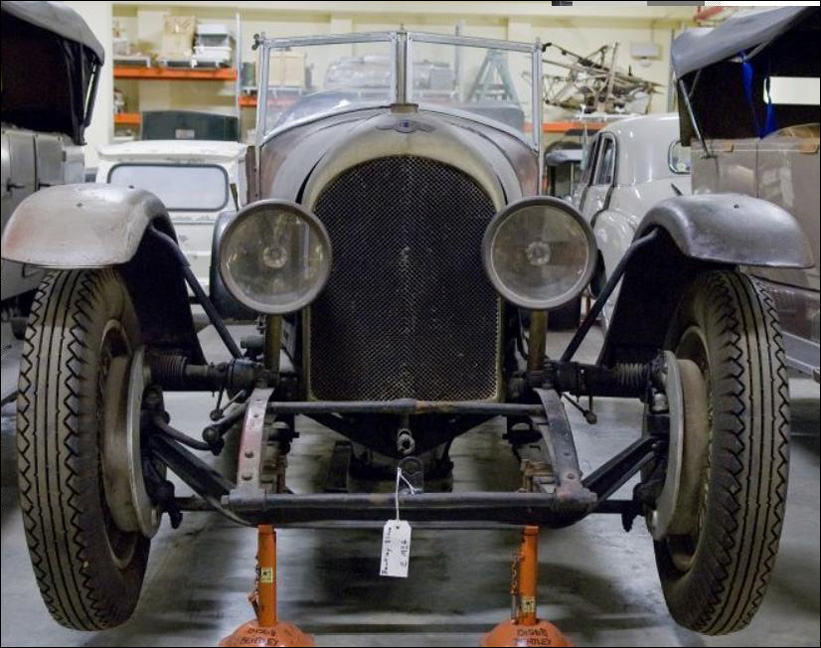 Mr Lade was persuaded to buy a Bentley when he was with the Bentley driving team at Le Mans in 1924 when Captain John Duff drove a Bentley to victory in the famous 24-hour speed and endurance race. Lade is said to have been taught to drive his car at the Brooklands racetrack, near London, under the tuition Captain Duff. He then imported the car to Tasmania in the 1930s and drove the car 100 miles per week in Tasmania over rough roads. The strong construction of the car no doubt enabling it to withstand the poor road conditions. Lade once covered 560 miles in a day in a wager against a 12-cylinder Fiat for the first to cross the Perth Bridge from Campbletown. To overtake the Fiat he is said to have driven the Bentley at 98 mph through Epping Forest. The car had several subsequent owners, firstly with a Shell salesman but finished its days driving a saw bench near Mt Barrow not far from Launceston. It was rescued from this situation and acquired by a friend of the vendor, Dr E. Gilford, of the X-ray Department of the Repatriation General Hospital, Heidelberg West, Vic, who lived at 9 Yallambie Rd, Macleod. The car had been advertised in 'The Age,' on Saturday, 13 June, 1964, and was described as a forced sale. The Museum purchased the car from Dr Gilford in 1964 for 353 pounds together with a box containing spare parts, body fittings, wiring and a radiator cap, two spare wheels (20 inches with tyre and tube, the other a 21 inch), a 12 volt 15 plate Lucas battery and an old seat. It was transported from Melbourne to the Museum in Sydney by Brambles Ltd.
