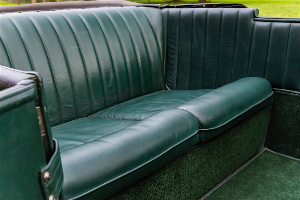The green convertible tourer is a fine looking car. With its massive hood and headlights, racing seats and exterior gas tank, it looks every bit the kind of racer that dominated race tracks in the late 1920s.