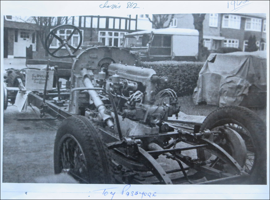 "I spoke with Tom Pasmore today. He was telling me that during his ownership in the 1960s he did a full chassis up rebuild of the car and engine. The back axle had a new 3.53 crown wheel and pinion, the engine bottom and top end were rebuilt by Syd Lawrence putting in oversize valves in the block. Tom said that he also raced the car at Silverstone during the 60s and how well it performed with 19 inch wheels on the rear."