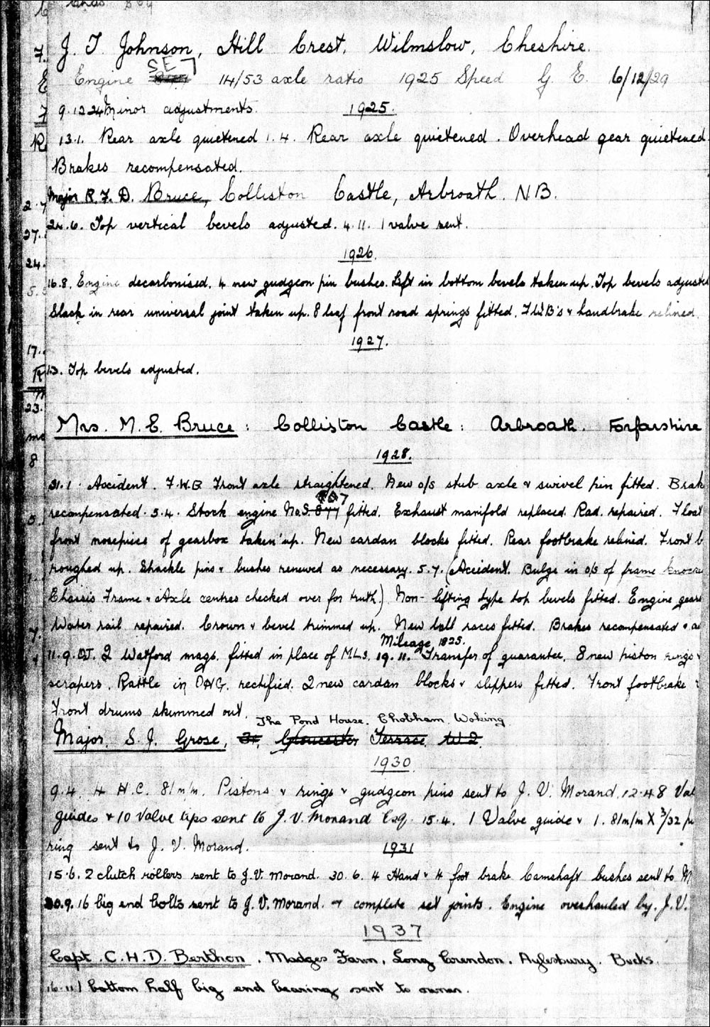 Mrs. Bruce took ownership of the Bentley from her husband sometime between Mar. 1, 1927 and Jan. 31, 1928. She wrecked the car on Jan. 31, 1928, causing the front axle to be bent. On May 4, 1928 extensive repair work was done to it. A factory service engine (SE7) was fitted in the car (Apr. 1928) while the work was in progress. The original engine (877) was refitted on completion and remains in the car today.