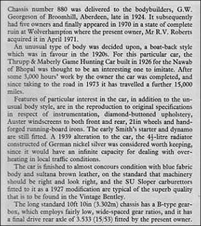 | More Info: | Michael Hay, in his book Bentley: The Vintage Years, 1997, states: "Was Mayfair saloon now MacNeille boat-tail with 4� Litre radiator and bulkhead. Engine RT 1529 ex RT 1537, since converted to 4� Litre." |