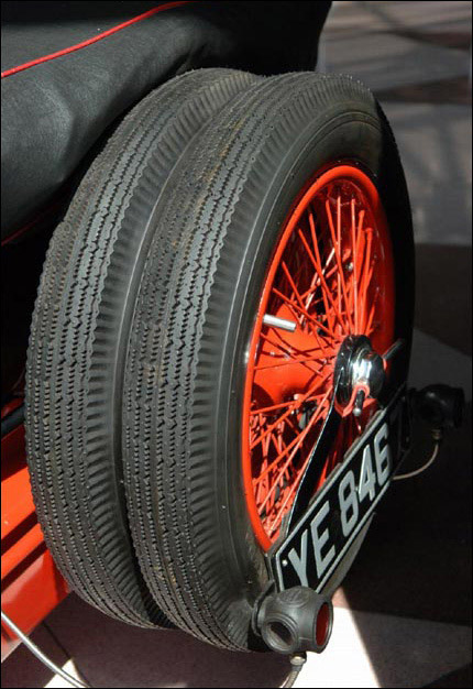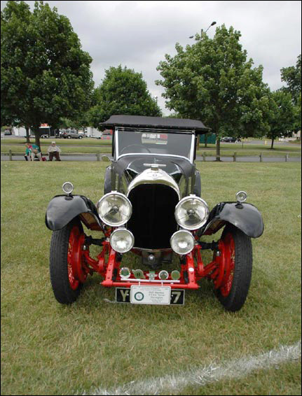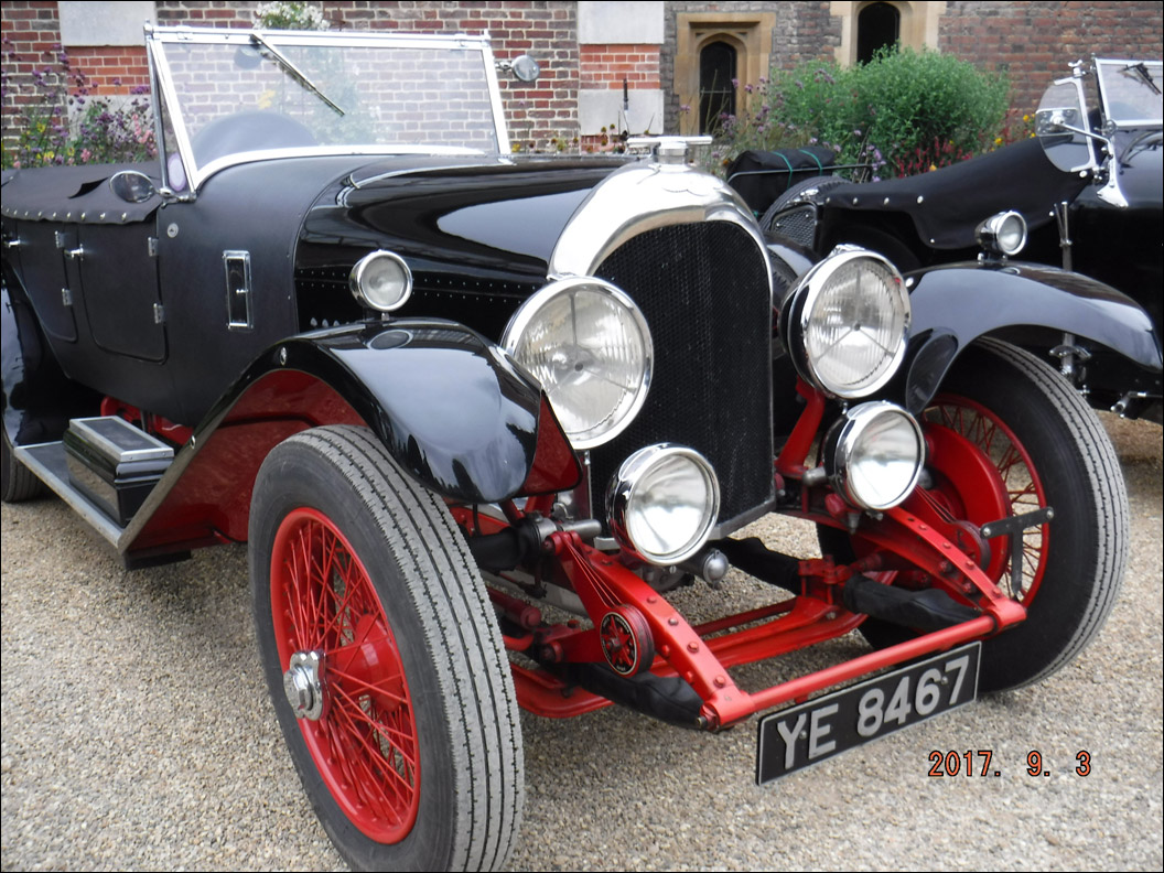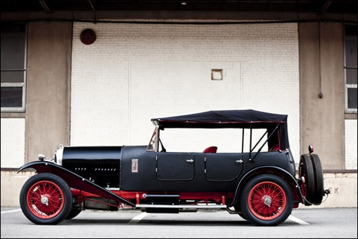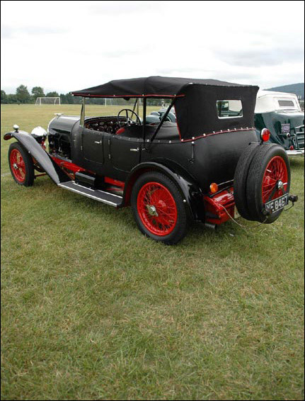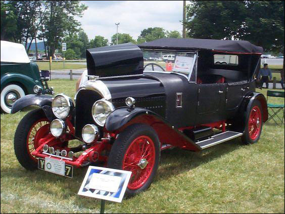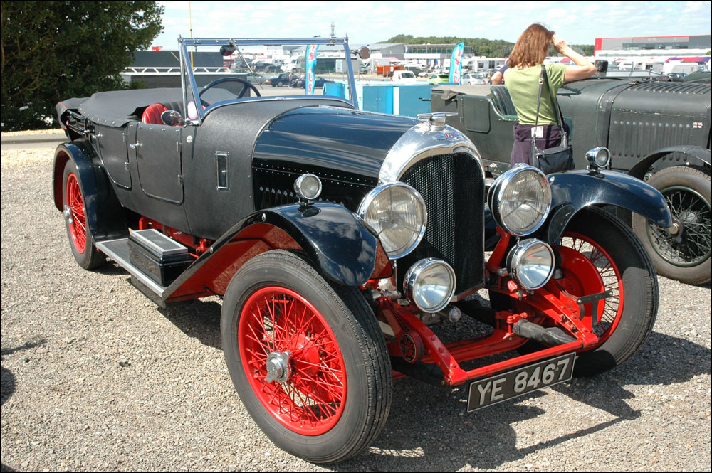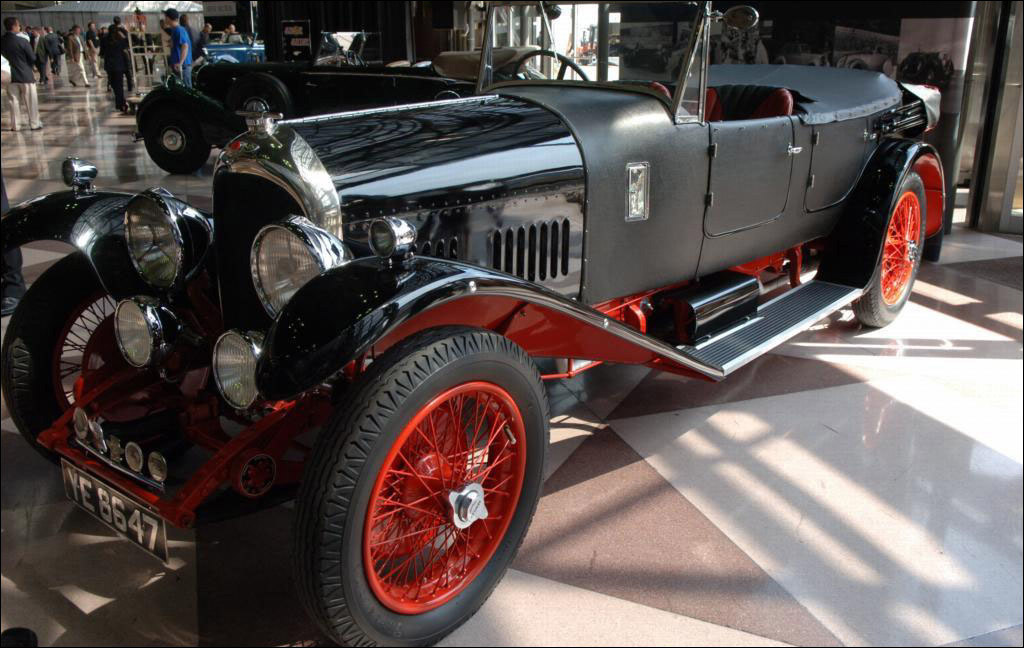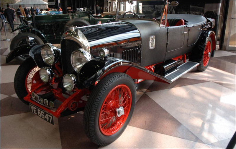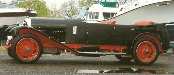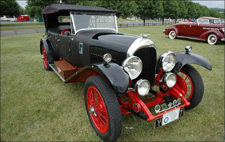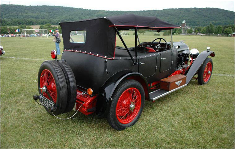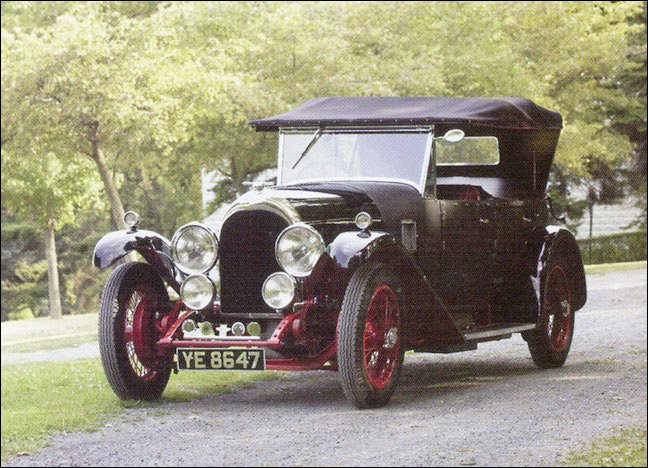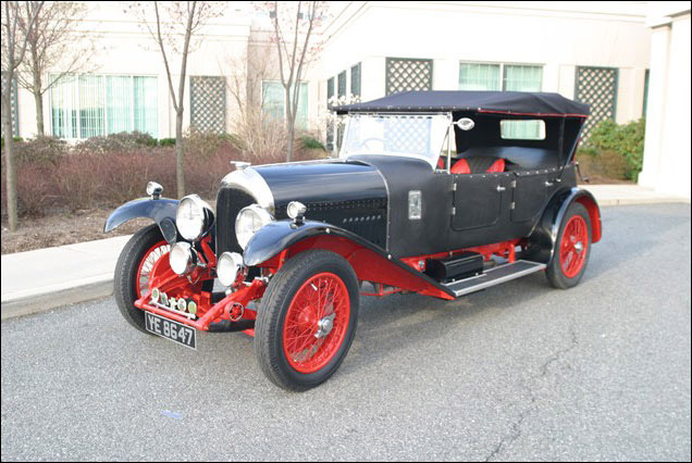 W.O. Bentley built his first car in 1919 having only enough money to make two experimental models. He did not deliver a car to a customer until 1921, the first models were three litre cars. These automobiles were not unique in design but were noteworthy for their strength and reliability. The three litre was a four cylinder water cooled design using a single overhead camshaft with twin carburetors and twin magneto ignition. This particular Bentley is a six wheel (two sidemounted spares) fairly standard open Tourer with top and side curtains. It is a right hand drive with one driving lamp mounted on the left front dumb iron. The car is in good condition with a four-speed transmission and good body and interior.
