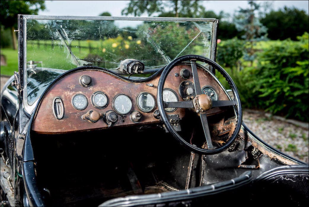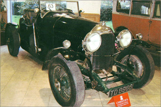 After nearly 40 years of hibernation, this 3 litre Bentley was unearthed by Christie's specialists in October. The car as it stands today represents the continuous history of a late 3 Litre Speed model, chassis number BL 1604. The car was sold originally in April 1927 to a Miss J. Kerr, and fitted with unusual 3 seater 'Cloverleaf' bodywork supplied by Vanden Plas (Body No. 1368). It was not only the bodywork which was specific to this car, but also the additional features of twin side mounted spare wheels and black oxidised screen and accessories. This is all confirmed in written form in Brian Smith's Vanden Plas Coachbuilders book, where it is illustrated and also in Johnnie Green's Fifty Years of the Marque. The completed car was registered new in Lancashire as confirmed by its 'TD' numberplate prefix.