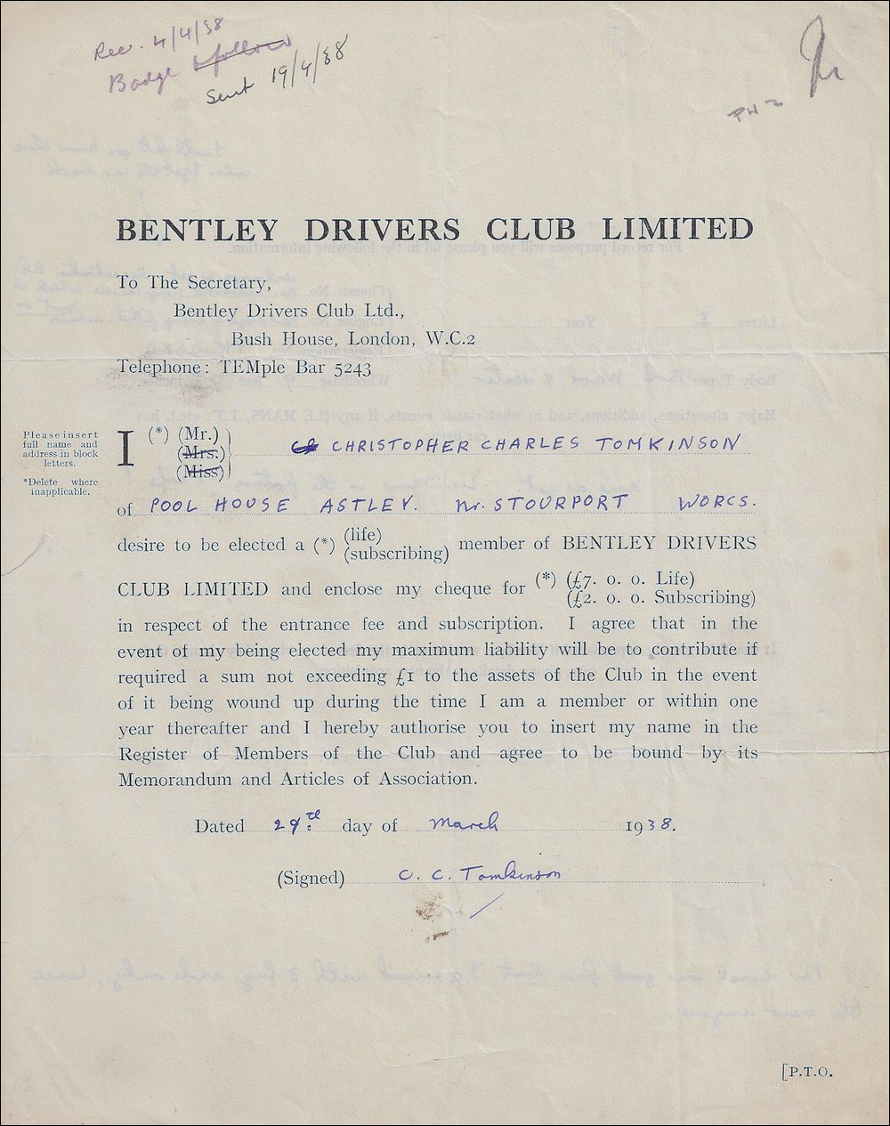 Arch Bentley man Christopher Tomkinson was born on September 14, 1916, only son of Major Herbert Tomkinson OBE TD and E.P. Tomkinson of Pool House, Astley, Worcestershire. His father headed a family carpet manufacturing business in Kidderminster and his mother was a member of the Thornycroft family whose companies built motor vehicles, engines and Royal Navy coastal warships.