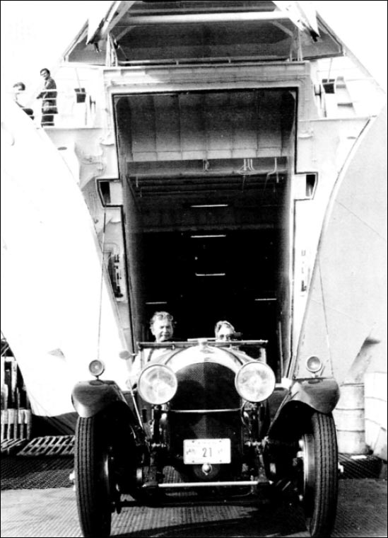 "Hugh Harben, Vice President of the Bentley Drivers' Club wheels Conrad Karras' 3 Liter Vintage Bentley DE1220 from the hold of the Norwegian M/S BOLERO. Initial reaction to loading was that a prehistoric monster was swallowing the cars." — From the article 'The Yankee-Maritime Spring Tour'