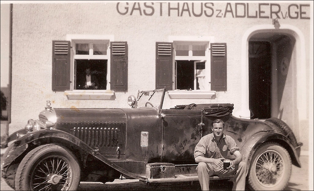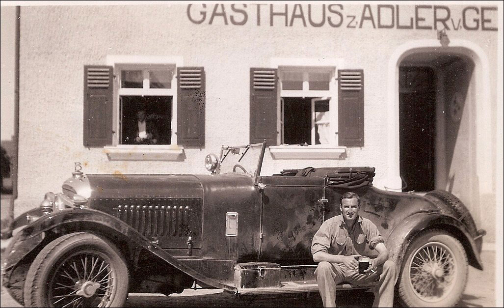 In his letter Mr. Robertson goes on to describe how he used the remainder of the insurance money to have a new body built. In his opinion the Harrison body was “a rather ugly high waisted” design. Mr. Robertson recalls that the body was built by Carbodies (a well known company) although some records show it as being built by Carvill or even Corsica. The design was a more up-to-date style of two-door roadster and, although very much in the style of some Corsica bodies was more likely to have been built by Carbodies. Once the car was back on the road Mr. Robertson recalled how he took the car to Monte Carlo for a holiday and another photograph of ‘OU 1179’ appears to show it there.