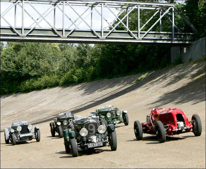 As the late, great Bill Boddy recalled in his definitive 'History of Brooklands Motor Course 1906-1940' - "Plug troubles foiled Birkin's hopes in the Dorset Lightning Short Handicap but he turned out again for a 3-lap match race against Dunfee's GP Sunbeam. Sadly Dunfee's car had thrown a rod, so Birkin came out alone, to attempt to beat Kaye Don's lap record. The Bentley was in grand trim, roaring very high round the Byfleet banking, dropping to the Fork in a puff of dust, clipping the verge by the Vickers' sheds and going onto the Members' banking each time with that characteristic and disturbing little snake that those who saw the car in action are not likely to forget. From the notorious bump" ? where the Hennebique Bridge near the end of the Member's Banking had subsided slightly into the River Wey ? "... it leapt some 70 feet, clear of the Track, onto the Railway Straight. It was a grand sight, Birkin's scarf flirting with the fairing behind his head as he held the car to its course. The 'Blower' Bentley certainly provided as great a thrill for the onlookers of the 1930s as had the V12 Sunbeam and the 'Chittys' for the 1920s...".