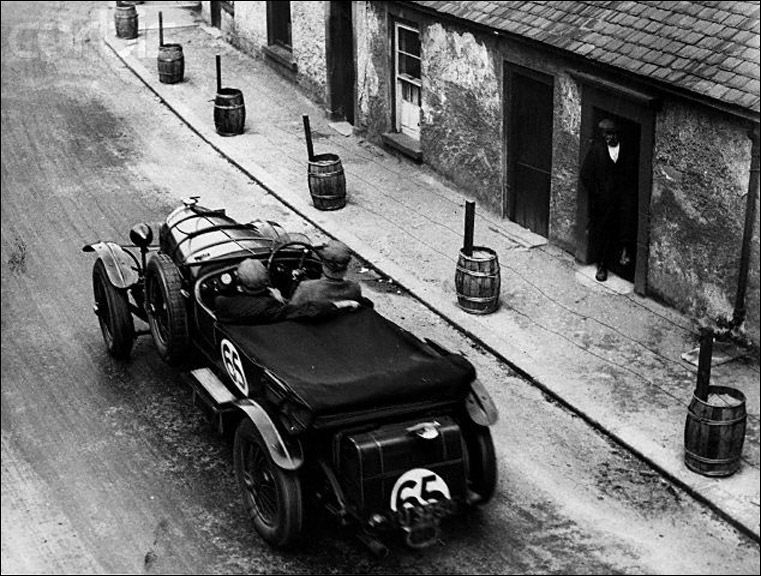 This picture is dated August 1929 and captioned: 'B. Harcourt Wood drives his Bentley past barricades placed along the street to protect houses before the start of an automobile race.'