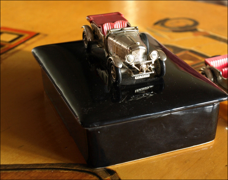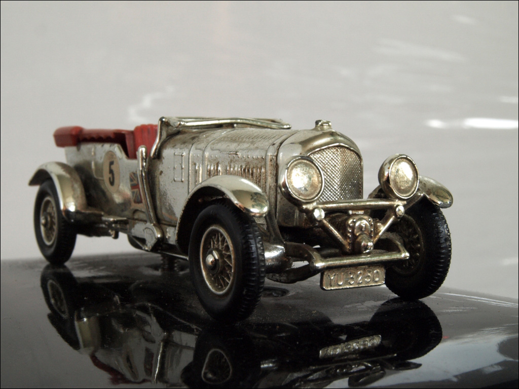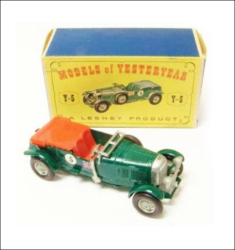 "This car was modeled by Lesney in its 'Models of Yesteryear' Series and marked 'No 5 Models of Yesteryear 4� Litre Bentley Made in England by Lesney.' The photograph shows the Bentley mounted on the box."
