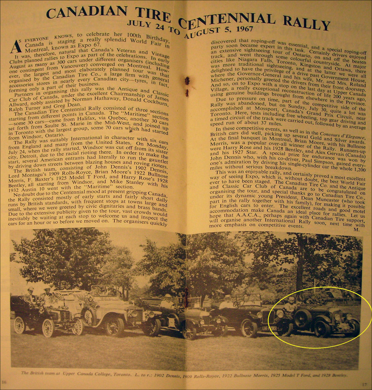 "I have a magazine 'Veteran and Vintage' (September 1967) which mentions this car competing in the 'Canadian Tire Centennial Rally. This event took place from July 24th to August 5th 1967. The driver (who I would assume was the owner at that time) was a Mr Harry Rose."