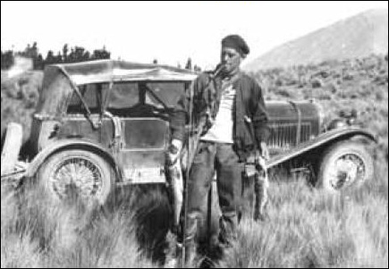 "Willis Brown's photograph taken at Easter 1961, when (from left) the Pinckneys in Rolls-Royce Silver Ghost 14KG, McKellars in their 4½-litre Lagonda, the Haggitts in their 3-litre Bentley 1063, and Browns in HF3198 travelled to Haast. The road through the Haast Pass was still largely unmade, and the connection with the rest of the West Coast was not completed until the end of 1965."