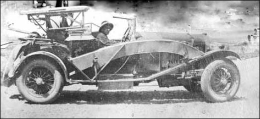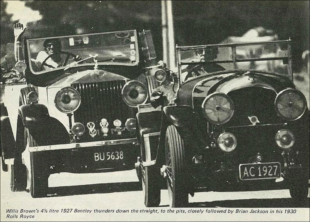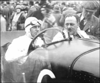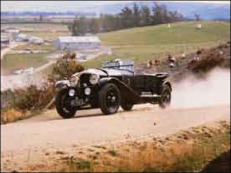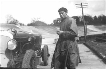 Bill Hamilton with one of his earlier inventions, called a Shingle Spreader, mounted on the 4½ litre BrooKlands winning Bentley HF3198.
