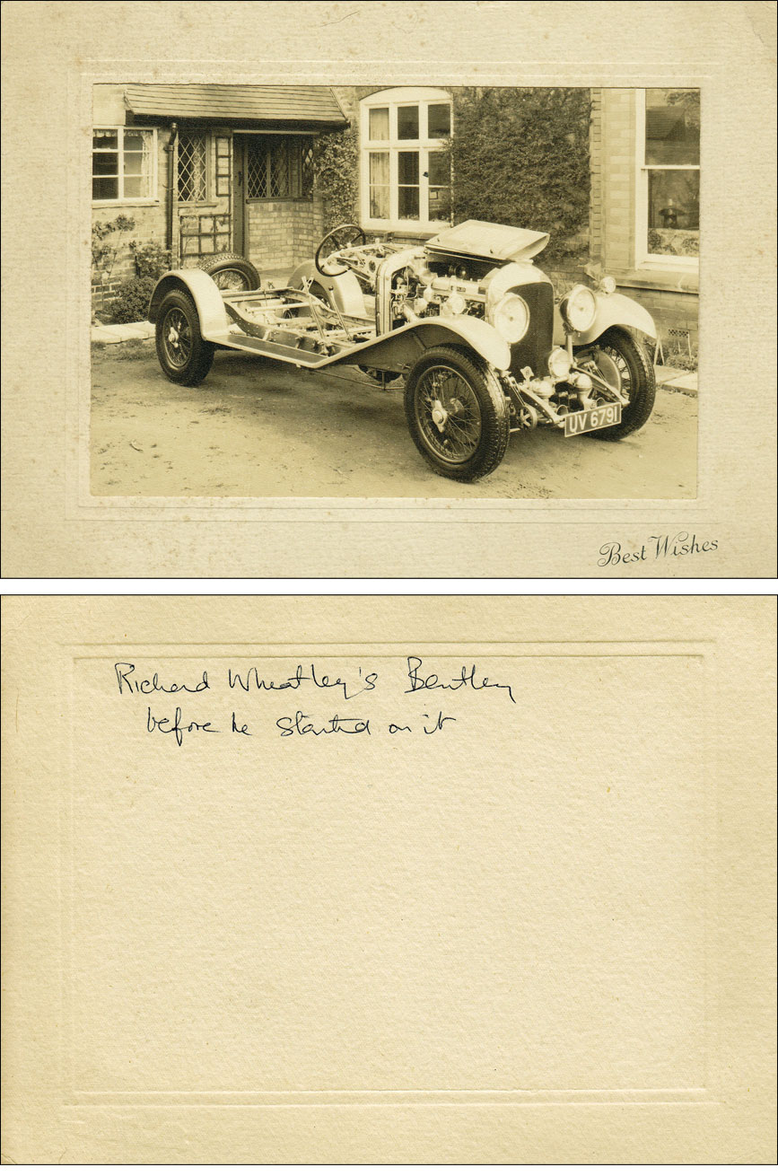 "I have recently acquired a photo of Bentley Reg. No. UV 6791, originally the property of Sir Malcolm Campbell. On the back of the photo is the message "Richard Wheatley's Bentley, before he started on it." The photo shows the car with pristine engine and chassis, but no coachwork. The photo has come from a house clearance with a number of other photos with various family names recorded on the back."
