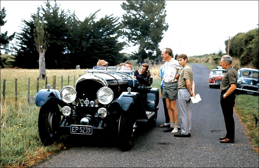 "Dave Bowman's 6½ Litre KR2692 in Taranaki during a Riley Car Club National Rally in 1968. Dave is accompanied by his two sons in the back seat and a visitor from Hawkes Bay. Those standing nearby are the late Clive Brownhill and Alan Wells, Glynn Williams, and the late Doug Dickenson. We don't remember why Alan is wearing only one shoe."