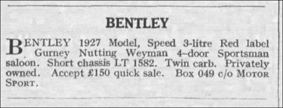 BENTLEY 1927 Model, Speed 3-litre Red label, Gurney Nutting Weyman 4 — door Sportsman saloon. Short Chassis LT1582. Twin carb. Privately owned. Accept £150 quick sale. Box 049 c/o MOTOR SPORT.