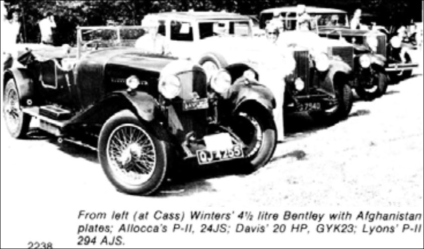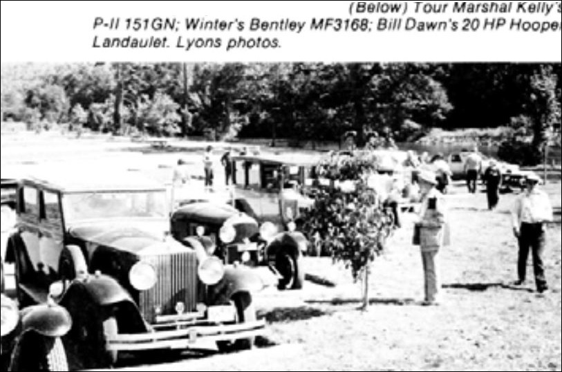 1. Second from left: Tour Marshal Kelly's P-ll 151 GN; Winter's Bentley MF3168; Bill Dawn's 20 HP Hooper Landaulet. Lyons photos.