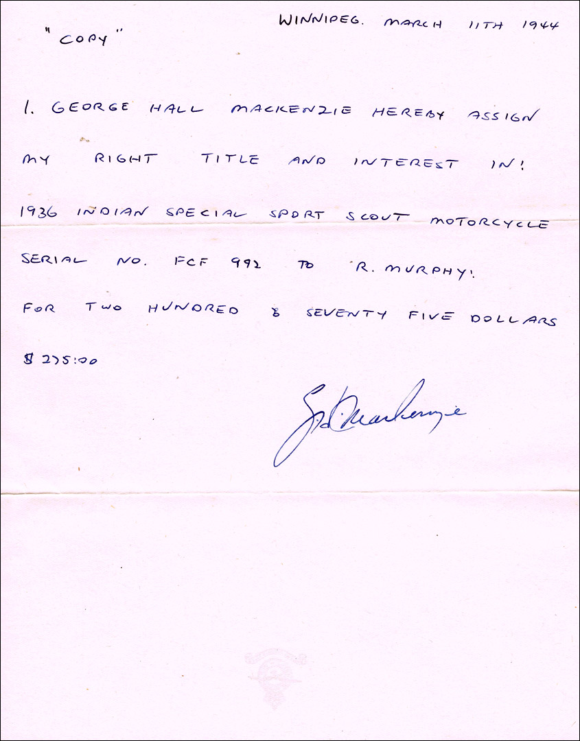 * The 1944 note selling the Indian Motorcycle to R. Murphy for $275