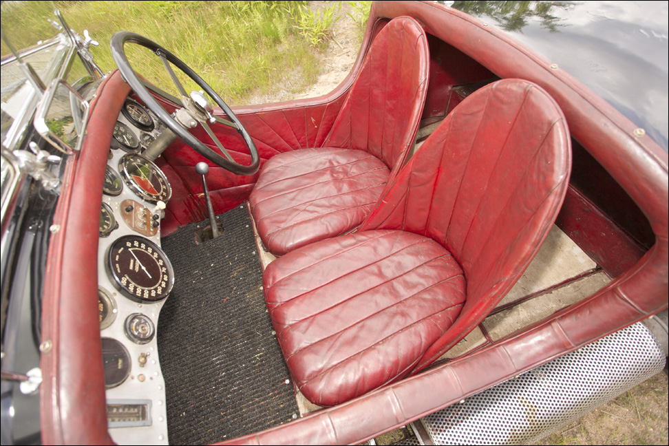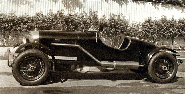 After driving it around for a few months, Johnson decided that the car should be restored and, while they were at it, do a few modifications. This work was described in much detail in an Article in the Autocar of July 7, 1944, but in brief, the Vanden Plas body was abandoned and a new ash and aluminum two-seater with no doors was fitted. To give the car a more pleasing rake a four inch block was placed between the underslung springs and rear axle, and a complete underpan was fabricated with the same 16-gauge aluminum as the body.
