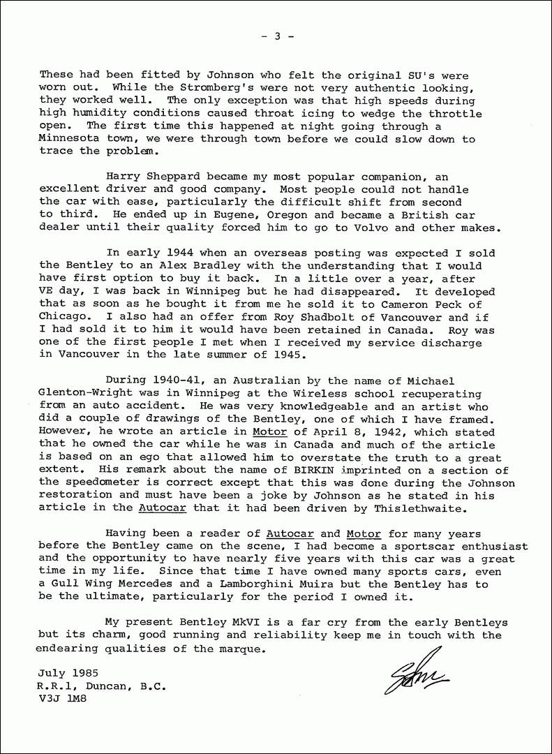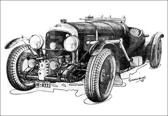 During 1940-41, an Australian by the name of Michael Glenton-Wright was in Winnipeg at the Wireless school recuperating from an auto accident. He was very knowledgeable and an artist who did a couple of drawings of the Bentley, one of which I have framed. However, he wrote an article in Motor of April 8, 1942, which stated that he owned the car while he was in Canada and much of the article is based on an ego that allowed him to overstate the truth to a great extent. His remark about the name of BIRKIN imprinted on a section of the speedometer is correct except that this was done during the Johnson restoration and must have been a joke by Johnson as he stated in his article in the Autocar that it had been driven by Thislethwaite.