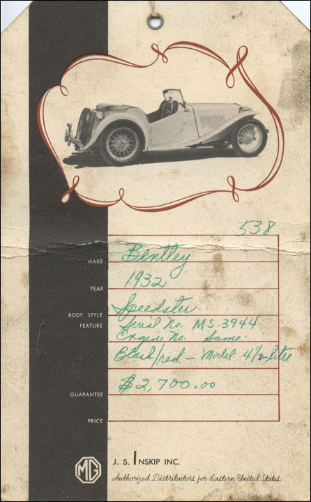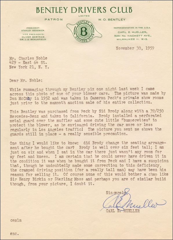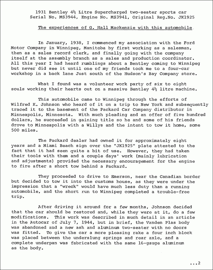 "My father owned a 1929 4½ Litre Blower in 1940 in Winnipeg Manatoba, Canada. It was modified into a 2 seater with the leather body removed and a boat tail installed. He owned this car for just over a year. The story was that it was brought to North America for a coast to coast race that for whatever reason never took place. I have pictures of the car. My father had to sell it when he went overseas in WW2. He was told that the car was returned to the New York area in the early 1940s. He bought the car for $500. and after he rebuilt the engine and drove it for a year he sold it back to the fellow he bought it from for $1000. This fellow's name was Hall McKenzie, a large Canadian car collector from those years. Any idea as to how I would find out just where this car ended up?