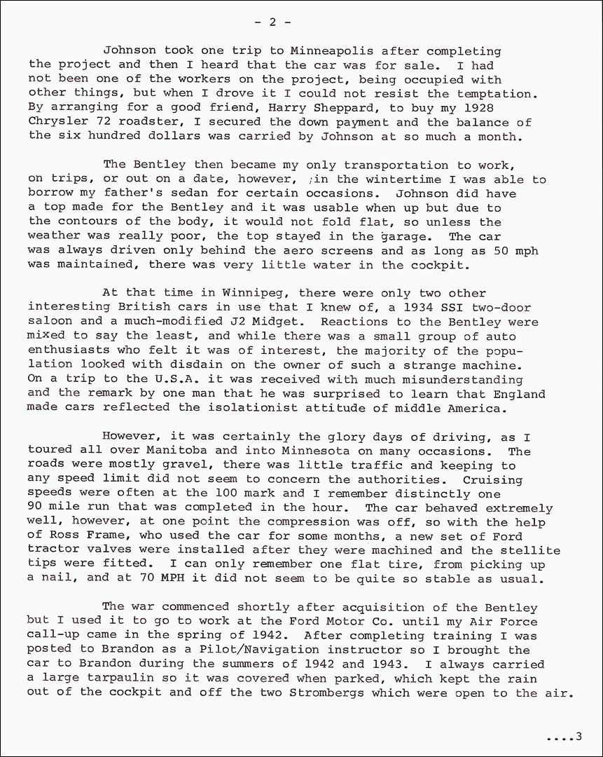 The war commenced shortly after acquisition of the Bentley but I used it to go to work at the Ford Motor Co. until my Air Force call-up came in the spring of 1942. After completing training I was posted to Brandon as a Pilot/Navigation instructor so I brought the car to Brandon during the summers of 1942 and 1943. I always carried a large tarpaulin so it was covered when parked, which kept the rain out of the cockpit and off the two Strombergs which were open to the air.