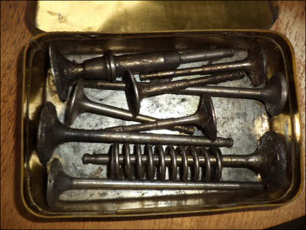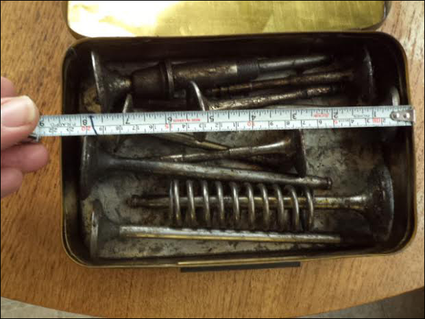 In the attic I found a very beaten metal box for a Dunlop tire repair kit. Inside, there are 8 very large (by modern standards) engine valves. I don’t know of any engines that my father rebuilt on the many cars he owned, and I remember reading that his friend Ross Frame replaced the valves on MS3944 with valves from a Ford tractor. It’s in his story posted below.