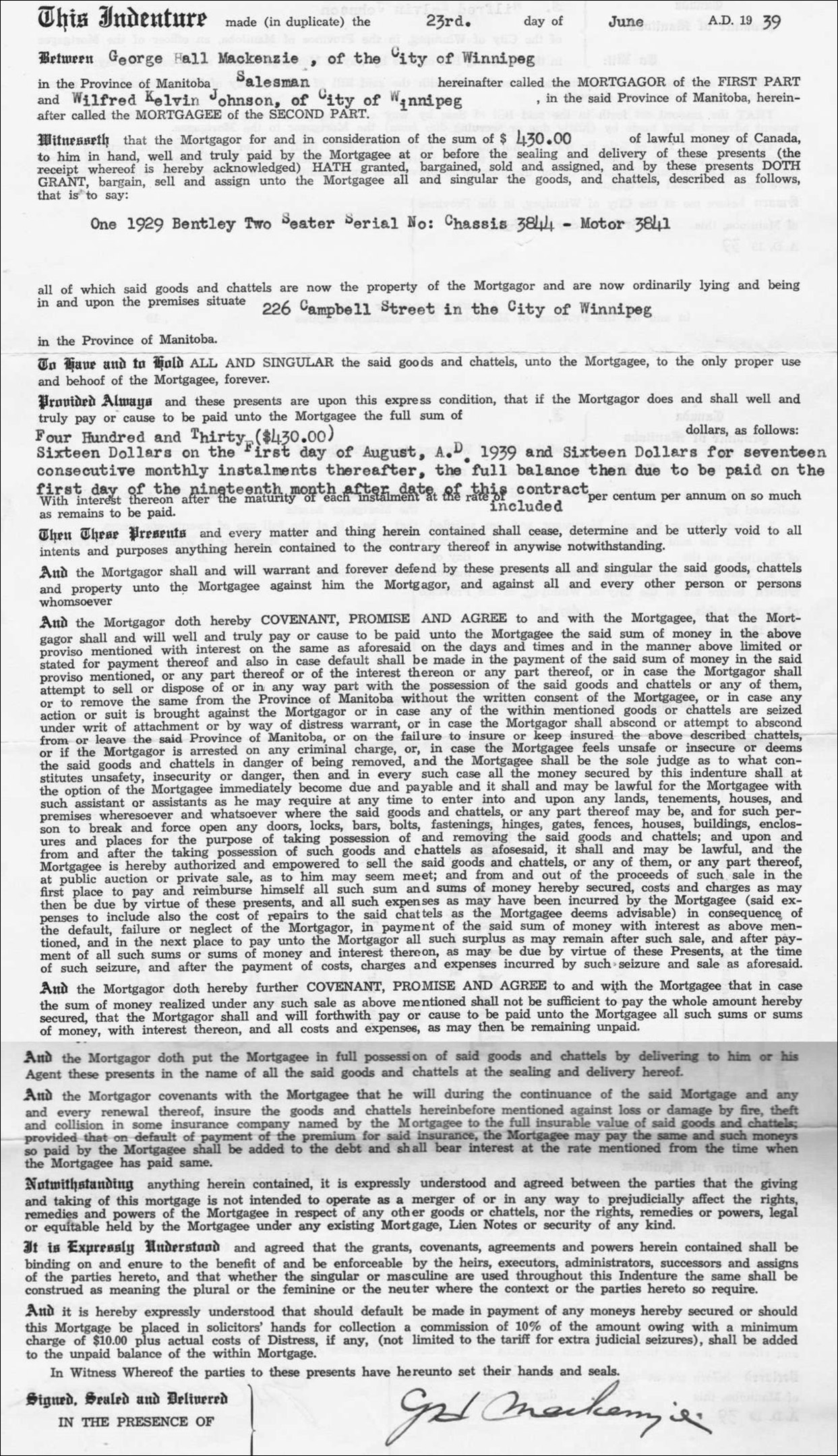 * The 1939 Indenture on the car holding up the agreement to pay by the month for 18 months, with balance due in 1941