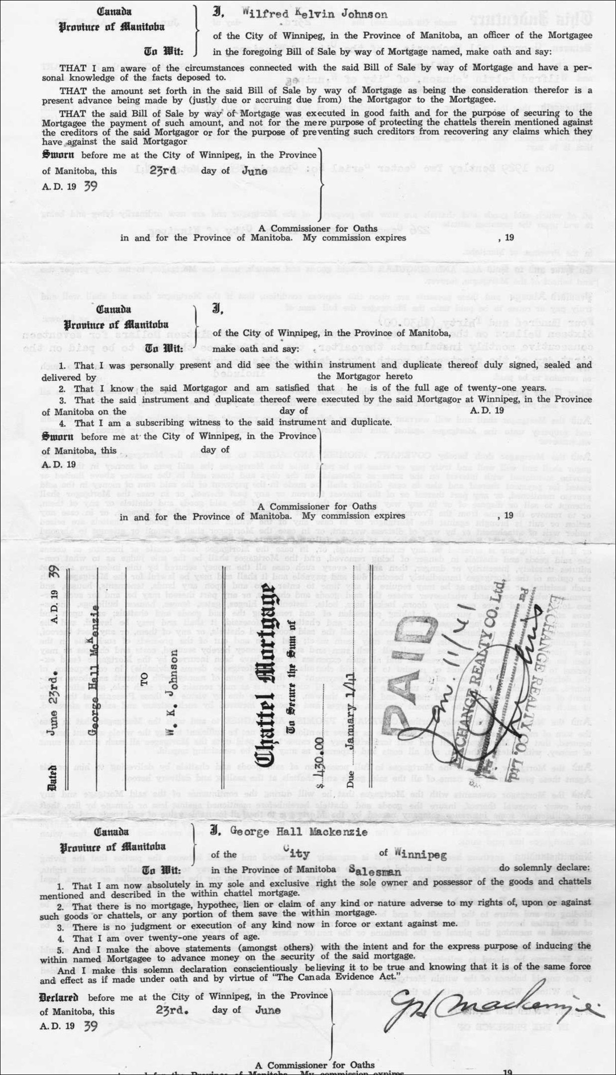 * The 1939 Purchase Agreement for $600 from Wilfred Kelvin Johnson, agreeing to pay $200 up front, and the balance at $16.00 / month