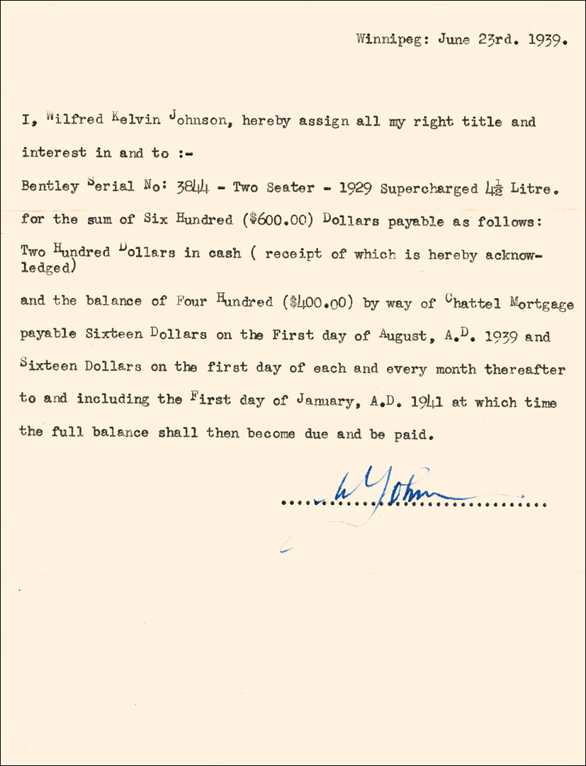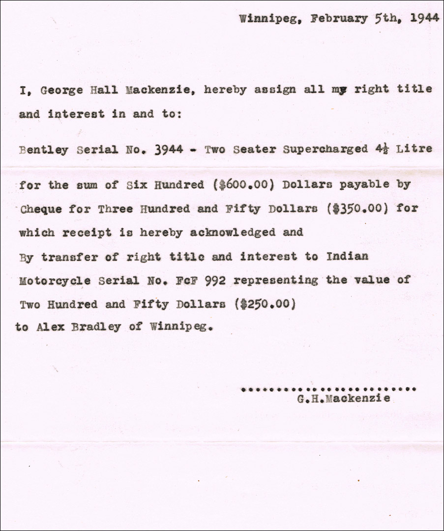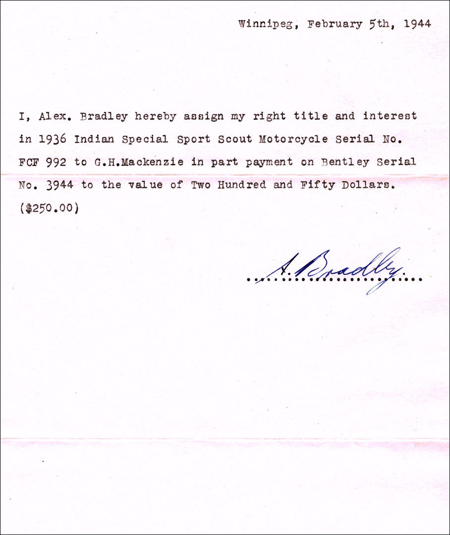 * The 1944 Sale Agreement, selling the Bentley to Alex Bradley for $600, by $350 cash and an Indian Motorcycle in trade worth $250
