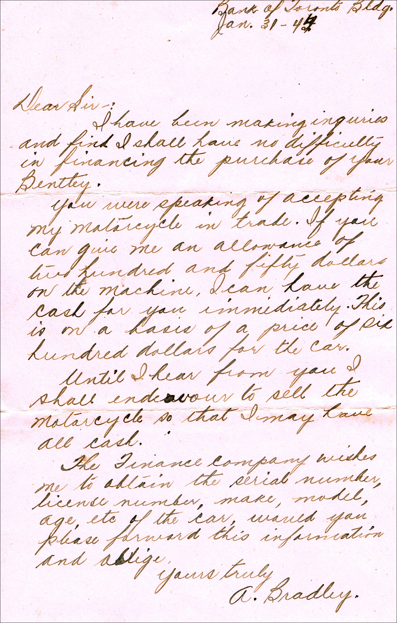 * A 1944 letter from Alex Bradley asking to purchase the car, with his motorcycle in trade