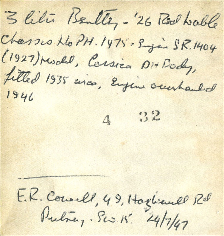 Chassis Number: PH 1475; Engine Number: SR 1404 (engine no. mentioned in October 2008 was SR1401 — perhaps a typo, but not sure which one is correct — VintageBentleys.org); Registration Number: BF 4359