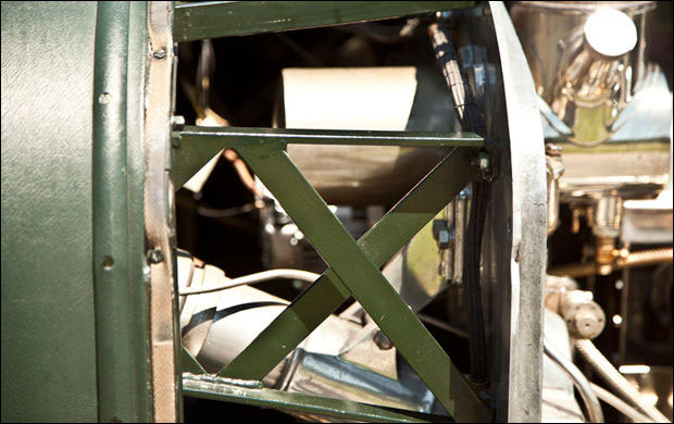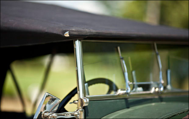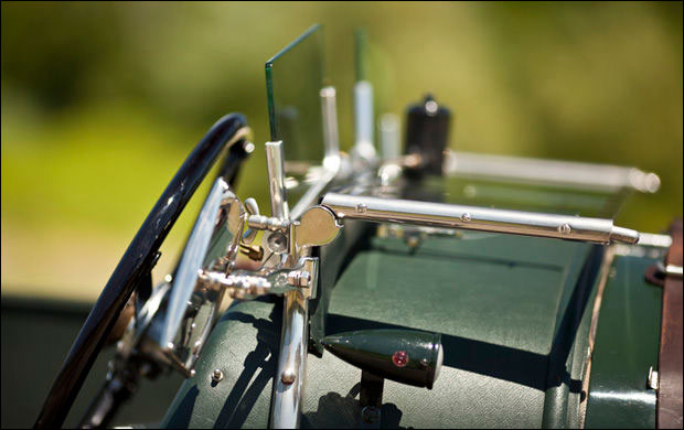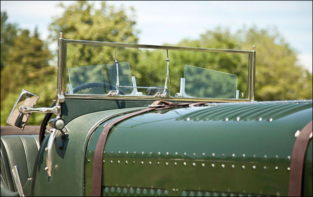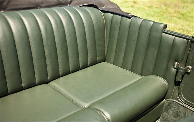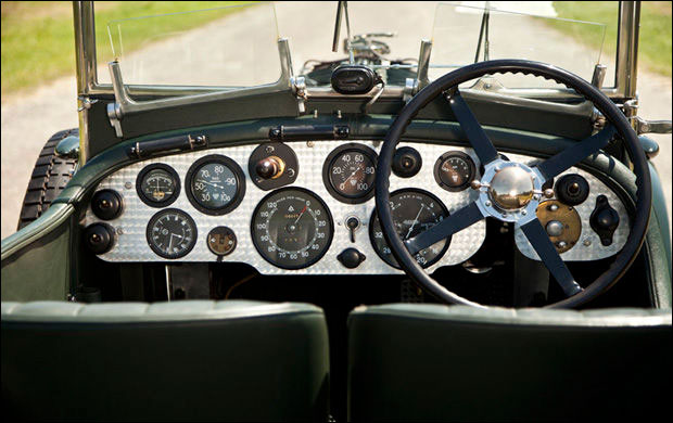 In 1999, the car was purchased by well-known Bentley enthusiast William Sykes and returned to the United Kingdom. The original, though arguably unattractive, Broom body was thus replaced with the current Vanden Plas–style Le Mans Tourer body. The new body was precisely crafted by specialist British coachbuilders James A. Pearce and Roger Wing, with sporting cycle fenders, a folding windshield and Brooklands windscreens, and correct Weymann patent bodywork of synthetic leather over a padded wooden frame. The car was also outfitted with a turned aluminum dashboard carrying the traditional large speedometer and tachometer, as well as other aeronautical-type gauges and an extended louvered bonnet and belly pans to better replicate the Le Mans appearance. Quick-release caps were installed on the radiator and the fuel tank, with the original, desirable “D-type” gearbox fitted with Laycock overdrive and an Eldown Engineering clutch conversion. The engine was overhauled with a Phoenix crankshaft, and dual Draper shocks were installed on the front axle. A large racing fuel tank was fitted along with proper Zeiss headlights, dual Bosch horns, and four “diver’s helmet” taillamps.