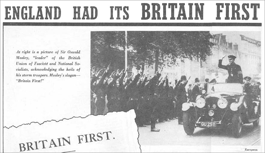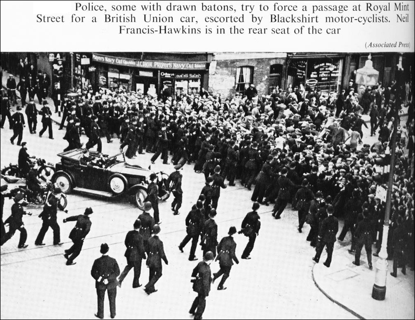 Photo 'B' "shows the Bentley with hood down occupied by Sir Oswald Mosley, the Leader of British Union; Neil Francis Hawkins, Director General of British Union; and Staff Driver George Armsden who was also Mosley's personal Standard Bearer. Photograph taken 4 October 1936 on the occasion that became known as the Battle of Cable Street: the police can be seen holding back Communist agitators attempting to prevent the march of 5000 Blackshirts through East London." - Photo source 'The Fascists in Britain' by Colin Cross (1961), made available by Jeff Wallder; text by Jeff Wallder