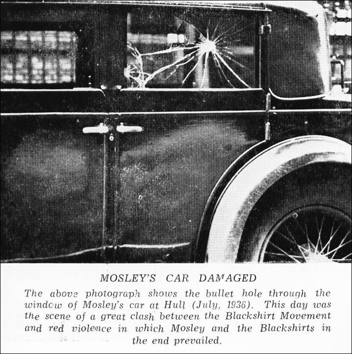 The above photograph shows the bullet hole following an unsuccessful attempt to assassinate Sir Oswald Mosley whilst he was visiting Hull for a major public meeting in July 1936. - Photo from book titled, 'Mosley: The Facts', 1958 made available by Jeff Wallder
