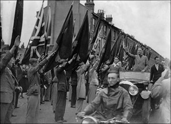 "(The car) seen here with the leader driving past the Blackshirt column on the Embankment after he had marched with them from Royal Mint-street folowing the 'Battle of Cable Street' on Oct 4, 1936. It was finally retired at the Blackshirt camp at Selsey in 1937 when O.M. was presented with a new MG by members of British Union." - June-July 1989 issue of 'Comrade', the 'Friends of Oswald Mosley' newsletter.