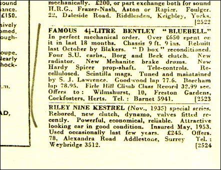 Early in 1950 'Bluebell' was acquired by Horace Wilmshurst and over the next two years continued to be energetically campaigned, winning at Feresfield, Goodwood, Hendon and Silverstone. Demonstrating that the Bentley had lost none of its roadability in the process of conversion for racing, Horace and his wife Joan took Bluebell on a 3,000-mile continental touring holiday in 1951. In July 1952 Wilmshurst sold the car to J A 'Joe' Walker, who continued to race it regularly until April 1957 when he crashed at Silverstone.