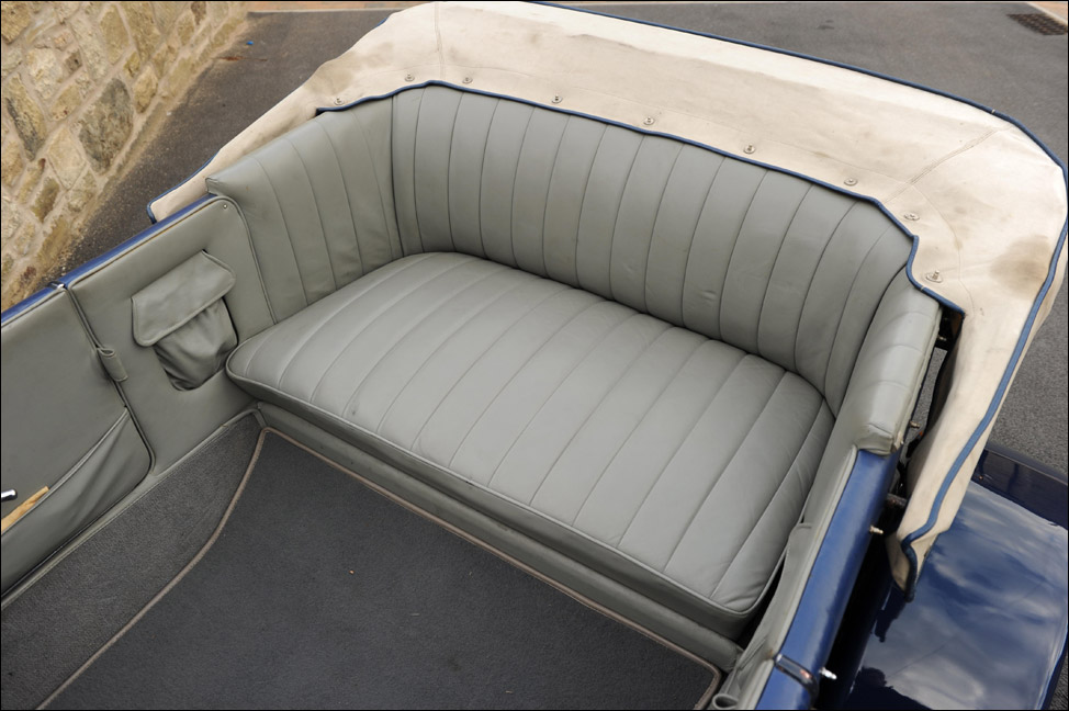 RL3441 is very smartly presented in blue livery with that delightful patina which is only acquired during long and careful use. The coachwork is upholstered in grey leather and furnished with over carpets back and front and is equipped with tonneau covers and side-screens and hood. Driving equipment includes Lucas P100 headlamps, Butlers side lamps and Lucas auxiliary driving lamps, together with flashing indicators with side markers, so essential for continental touring. Other essential touring equipment includes twin side-mounted spare wheels, fold-down windscreen with side wind deflectors, luggage rack with substantial luggage trunk, matching rear-view mirrors, leather spring gaiters and a GB plate. A toolbox is fitted on the offside running board and the car carries two fire extinguishers and an Esso two-gallon spare fuel can.
