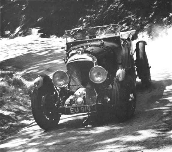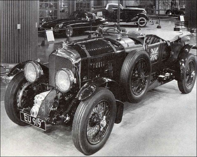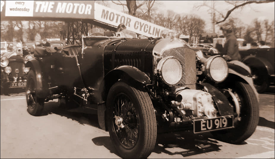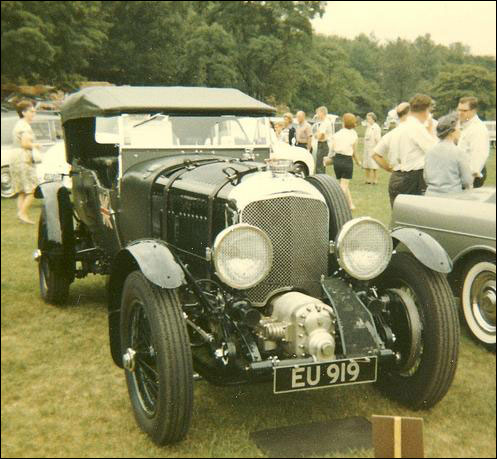 (Four Bentleys from the Klein Collection in Elizabethtown, Pennsylvania, in the 1960s. Nearest the camera is 3 litre Vanden Plas Speed Model YR5725, chassis LT1579, rebuilt to Kensington Gardens concours standard by Dick Moss. Next another Vanden Plas car, this time a 1928 4 1/2 litre chassis FT3210 delivered new to L. Du Pont Copeland, and blower 4 1/2 EU919 with Birkin replica body by Townshend. Finally a second blower 4 1/2, chassis MS3932 registered GN6087, with its original high-sided Vanden Plas four-seater body, a sister car to GO2641.)