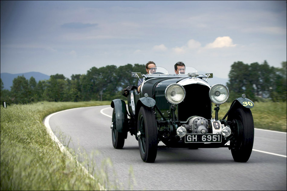 Following them in a W-12 Continental GT coupe I was surprised that even in the confines of the air-conditioned cabin, and trailing them by 100 yards, how their distinctive exhaust notes could be heard: the 1929 Team car, No. 9, with its fishtail exhaust a deeper, bassier note than the 1930 car with its standard exhaust.