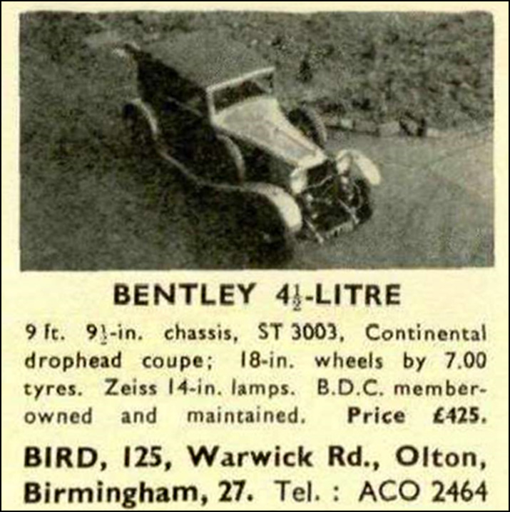 9 ft. 9½-in. chassis, ST 3003. Continental drophead coupe; 18-in. wheels by 7.00 tyres. Zeiss 14-in. lamps. B.D.C. member-owned and maintained. Price £425. Bird, 125, Warwick Rd., Olton, Birmingham, 27. Tel. : ACO 2464