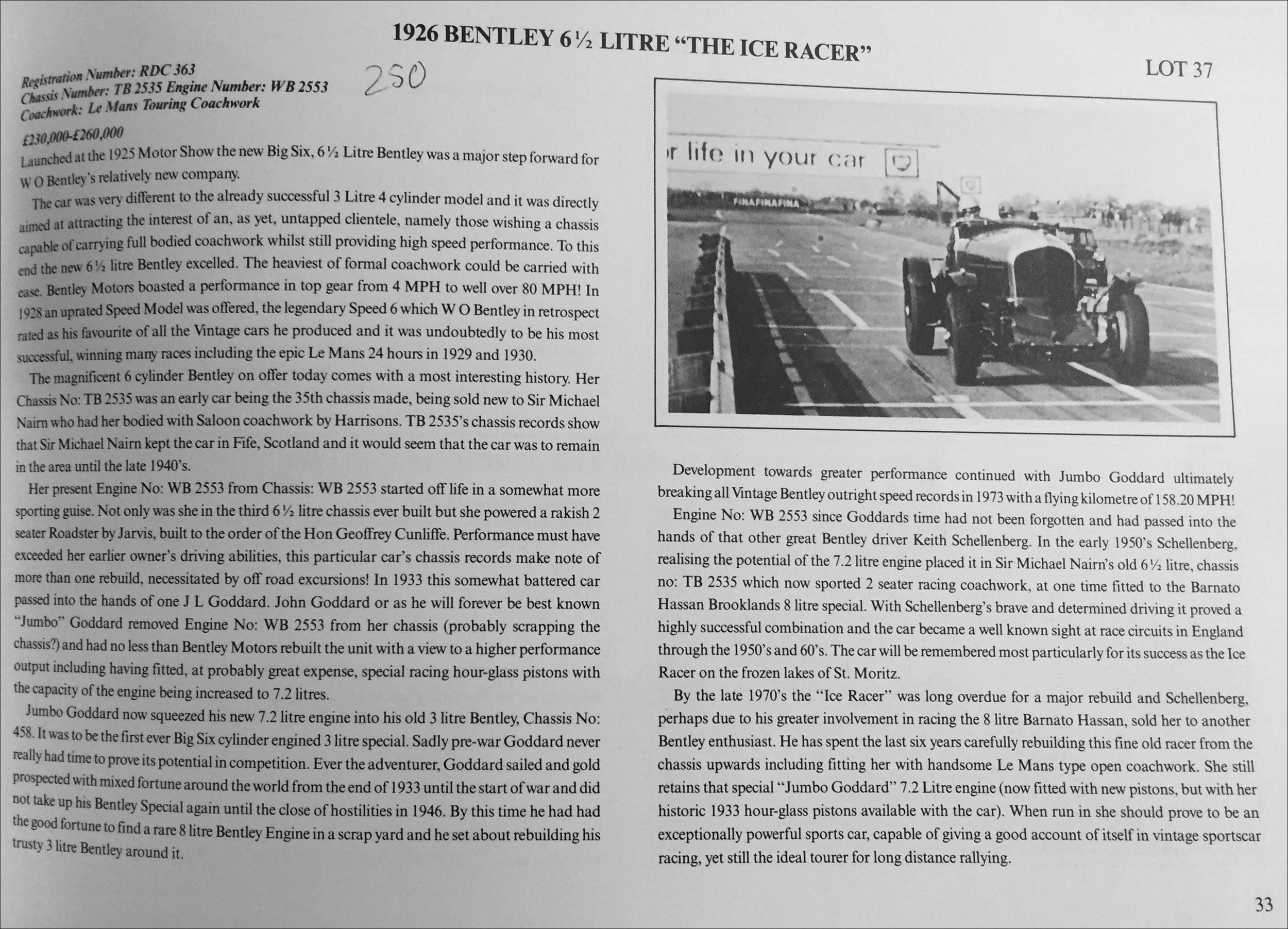 | More Info: | Michael Hay, in his book Bentley: The Vintage Years, 1997, states: "BS box. 1930 "Sankey wheels fitted". Hearse, later modified/swopped around by Bailey. Reg BSP 479 (1937), RDC 363 (1963), DS 8627, now YN 6809 (original number of WB 2553). Used for ice-racing with body off Barnato-Hassan. Now Le Mans replica, eng WB2553 ex WB2553." |