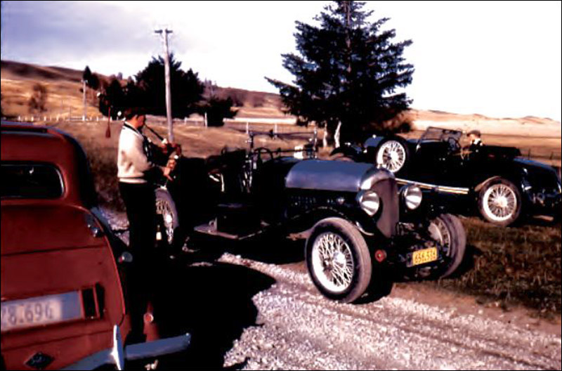 Bob Beardsley is seated in George Wright's 4½ litre, chassis UK3285, showing signs of damage it received the evening before. (Gavin Bain is seen with his bagpipes with his recently acquired 3 litre, Chassis 728 at Pukaki Station on the 1964 Irishman Creek Rally.)