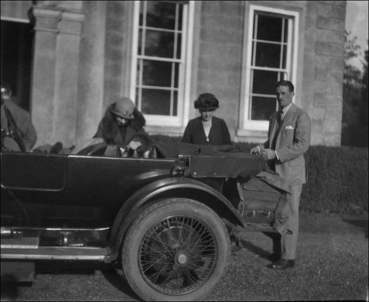 1929(?) Owned by Sir Philip Brocklehurst. At The Franchise, Burwash, Sussex, England. The man standing at the back of the car is Sir Philip Brochlehurst. His mother, Lady Annie, is next to him and his wife, Lady Gwlady to the far left. Looks like they are packing to go back home to Swythamley.