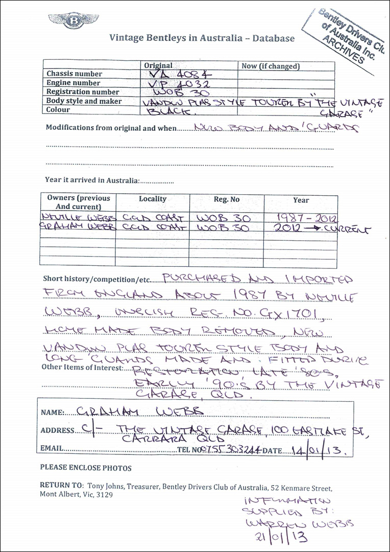 | More Info: | Michael Hay, in his book Bentley: The Vintage Years, 1997, states: "F/8120. Fitted 4 seat tourer, original body in store. Now in Australia." |